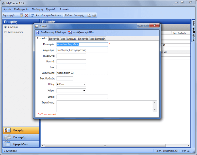 - Να καταχωρήσετε τους πελάτες και τις επαφές σας συμπληρώνοντας μια μεγάλη πληθώρα από στοιχεία όπως ονοματεπώνυμο, πατρώνυμο, επωνυμία, κινητό τηλέφωνο, email, ταχυδρομική διεύθυνση και πολλά άλλα.